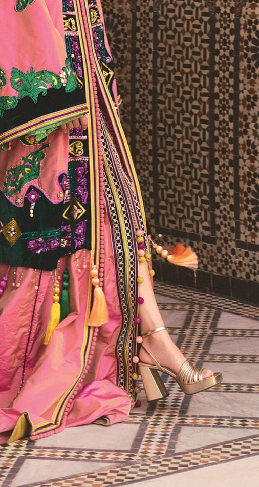 Slingback en satin. Bout pointu. Talon moyen. Détail d’ornements cloutés dorés sur l’empeigne. Silhouette audacieuse et élégante.