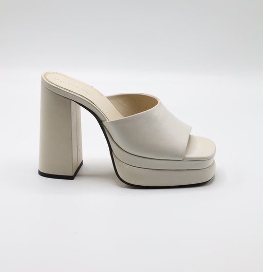 Chaussure à talons mi-hauts style sandale en cuir avec bride large sur le devant. Bout rond. Fermeture avec boucle.Talon large de 4,5cm.