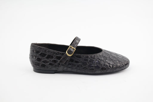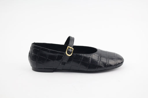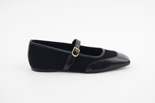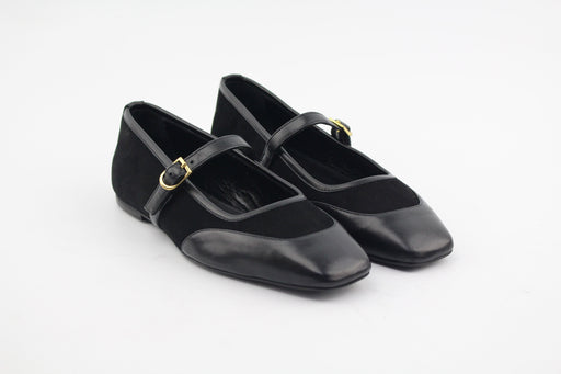 Chaussures plates style ballerines babies en cuir nappa. Double bride à boucle dorée . Bout carré . Talon de 0,7cm