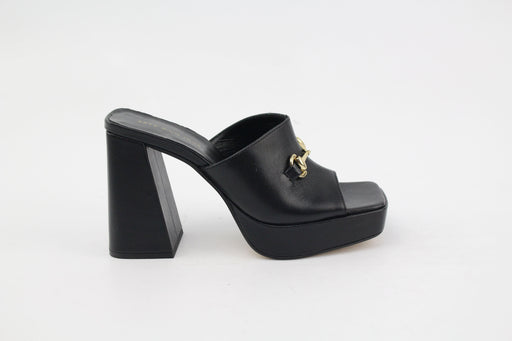 Mule à talon carré haut. Bout carré. Empeigne en cuir avec détail mors doré. Allure citadine et moderne.