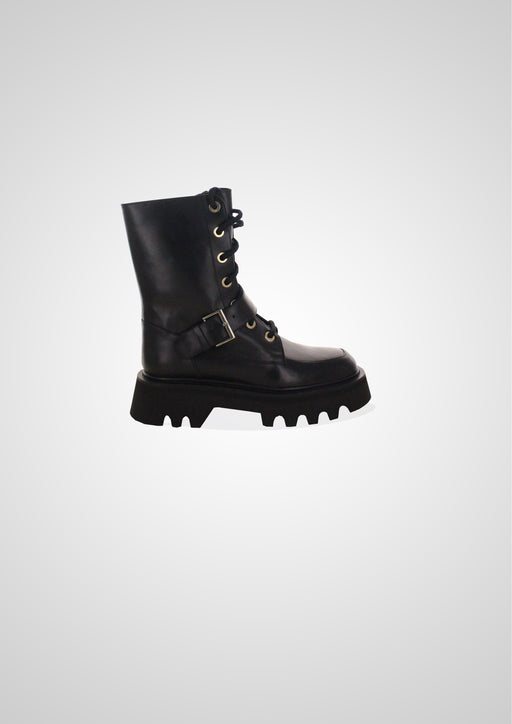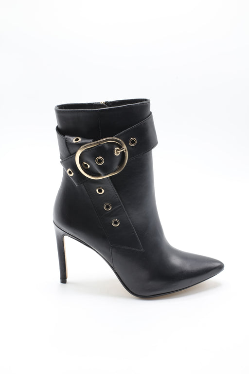 Chaussure à talons mi-hauts style sandale en cuir avec bride large sur le devant. Bout rond. Fermeture avec boucle.Talon large de 4,5cm.