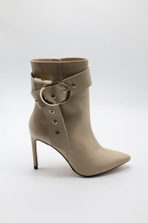 Chaussure à talons mi- hauts style sandale en cuir blanc écru. Bout rond. Avec accessoire métallique sur l'avant. Fermeture avec boucle. Talon lar...