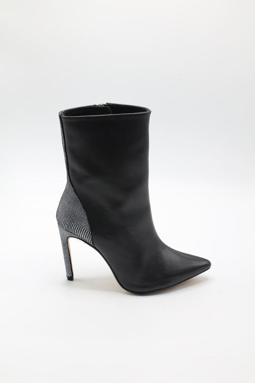 Chaussure à talons mi-hauts style sandale en cuir avec brides fines croisées sur le devant. Bout rond. Fermeture avec boucle.Talon large de 7,5cm