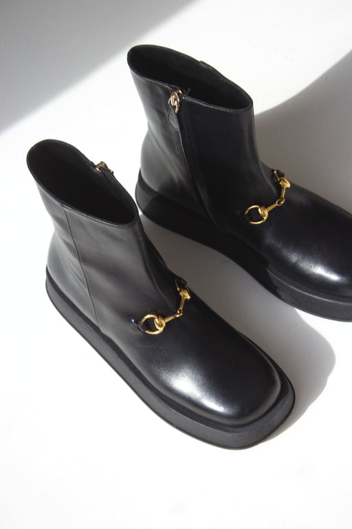 Sandale en cuir grainé. Talon carré bas. Bout carré. Détail de brides à boucles dorées. Élégance décontractée.