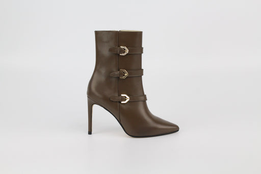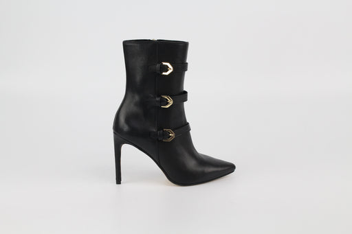 Chaussure à talons mi-hauts style sandale en cuir avec brides fines symétriques sur le devant. Bout rond. Fermeture avec boucle.Talon large de 7,5cm.