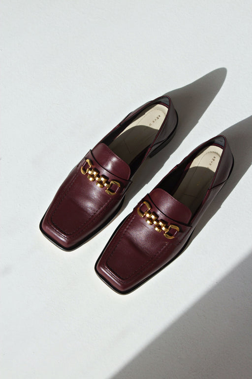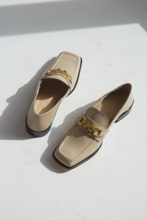 Mule à talon moyen en satin. Bout pointu. Détail de boucle sur l’empeigne. Talon moyen. Élégance minimaliste.