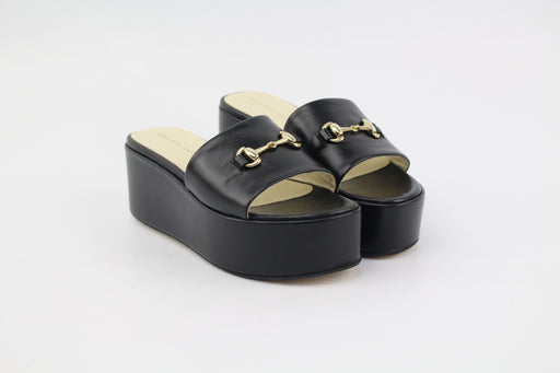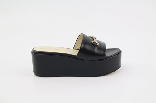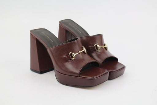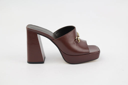 Mule plateforme en cuir lisse. Bout carré. Détail mors métallique sur le dessus. Allure urbaine et affirmée.
