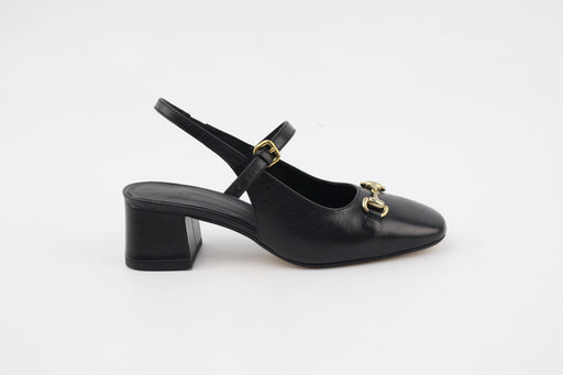Slingback en cuir lisse. Bout arrondi. Détail de mors doré sur l’avant. Talon bloc. Parfait équilibre entre chic et confort.