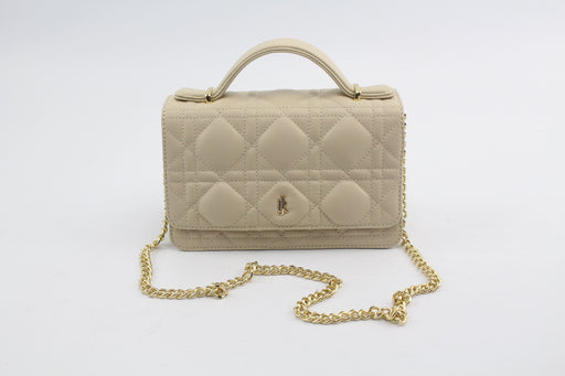 Sac à main en cuir matelassé avec pièce logo et bandoulière dorées.